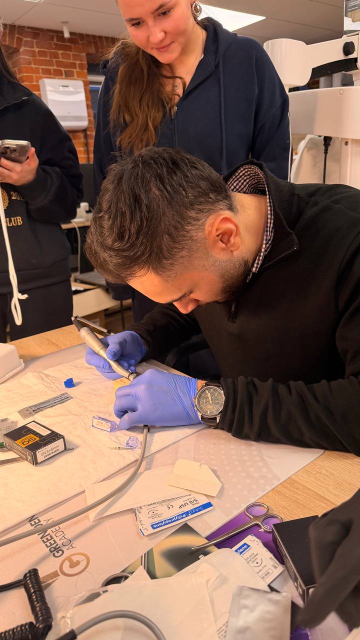 Курс включал в себя насыщенную теорию и практику с отработкой навыков установки имплантатов на моделях и соблюдением параллельности. Будущие стоматологи также научились выполнять забор мягкотканого трансплантата, фиксацию к лоскуту и наложение швов.